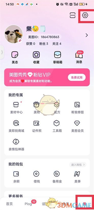 1.打开美图秀秀软件,点击右下角【我】,进入我的页面,点击右上角【设置】图标;