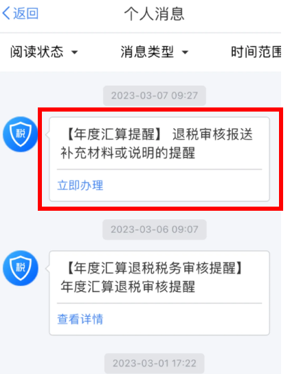 退税的时候如果一直在税务审核中,注意看一下消息界面里面的内容,也就是下图画圈的部位。