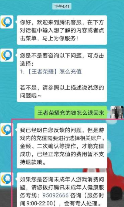 3.点击联系客服,输入王者荣耀充的钱怎么退回来。