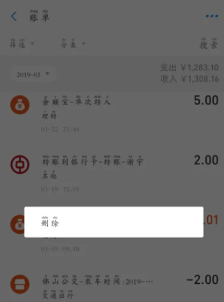 第四步,找到账单中要删除的的交易记录。长按记录后,弹出删除窗口,点击即可。