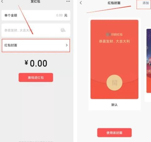 3、点击红包界面后,点击“红包封面"四个字,点击右上方的“添加";