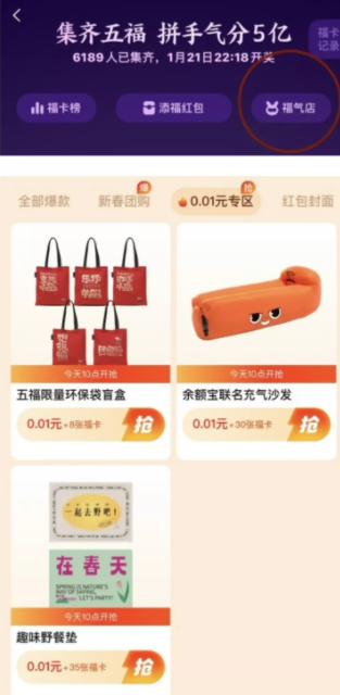 右上角福气店,0.01元专区,10点开抢。