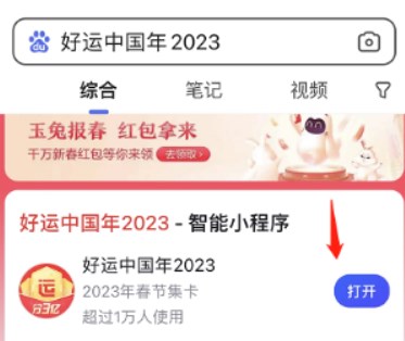 1、升级百度app到最新版本,通过搜索“好运中国年2023”,找出活动小程序入口,点击打开。