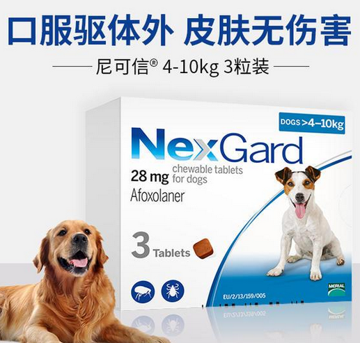 尼可信这款驱虫药,它可以很好的驱杀狗狗体外常见的寄生虫,像跳蚤、蜱虫、螨虫、虱子等等类型,同时尼可信在广泛驱虫的同时还能做到高效驱杀寄生虫,尼可信能够在用药后2h起效,6小时100%解决跳蚤问题,一天搞