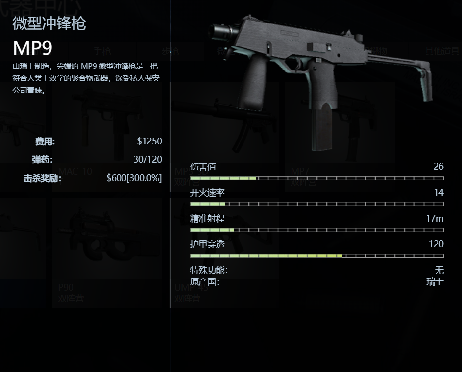 这是一把相对于T方Mac10为CT方设计的武器,在性能上两把枪几乎无异,那么在游戏里MP9价格是多少?武器好不好用?下面就将带CSGO MP9图鉴介绍,希望对大家有所帮助。CSGO微型冲锋枪。