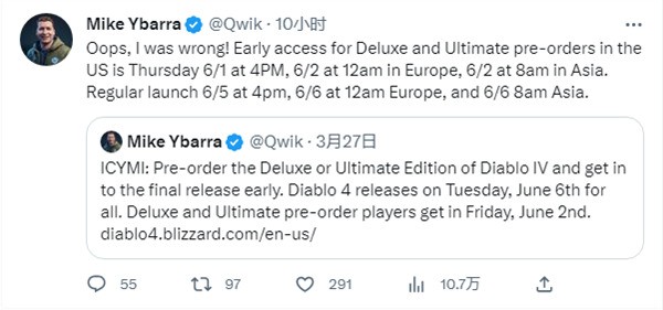 近日,暴雪总裁Mike Ybarra发布了《暗黑破坏神4》标准版、豪华版与终极版的发售时间。豪华版和终极版的用户6月2日早8点可解锁亚洲服务器进入游戏,而鼻癌准办用户要