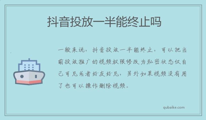一般来说,抖音投放一半能终止,可以把当前投放推广的视频权限修改为私密状态仅自己可见或者好友好见,另外如果视频没有用了也可以操作删除视频。