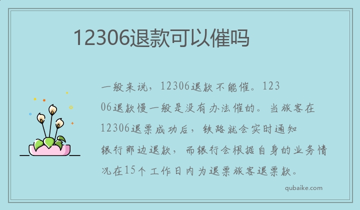一般来说,12306退款不能催。12306退款慢一般是没有办法催的。当旅客在12306退票成功后,铁路就会实时通知银行那边退款,而银行会根据自身的业务情况在15个工作日内为退票旅客退票款。