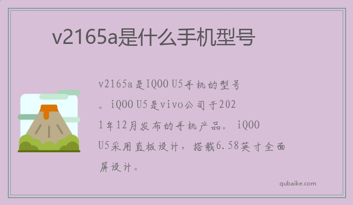 v2165a是IQOO U5手机的型号。iQOO U5是vivo公司于2021年12月发布的手机产品。 iQOO U5采用直板设计,搭载6.58英寸全面屏设计。