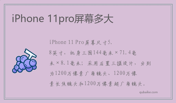 iPhone 11 Pro屏幕尺寸5.8英寸,机身三围144毫米×71.4毫米×8.1毫米;采用后置三摄设计,分别为1200万像素广角镜头、1200万像素长焦镜头和1200万像素超广角镜头。