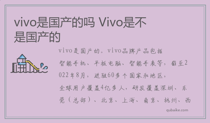 vivo是国产的。vivo品牌产品包括智能手机、平板电脑、智能手表等,截至2022年8月,进驻60多个国家和地区,全球用户覆盖4亿多人,研发覆盖深圳、东莞(总部)、北京、上海、南京、杭州、西安等。