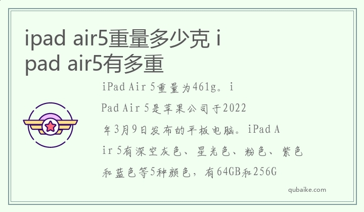 iPad Air 5重量为461g。iPad Air 5是苹果公司于2022年3月9日发布的平板电脑。iPad Air 5有深空灰色、星光色、粉色、紫色和蓝色等5种颜色,有64GB和256GB两种容量版