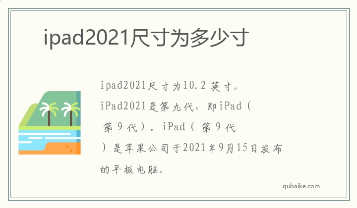 ipad2021尺寸为10.2 英寸。iPad2021是第九代,即iPad( 第 9 代)。iPad( 第 9 代)是苹果公司于2021年9月15日发布的平板电脑。