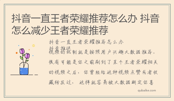抖音一直王者荣耀推荐怎么办抖音推送视频的机制就是按照用户兴趣大数据推荐。很有可能是你之前刷到了某个王者荣耀相关的视频之后,你曾经给这种视频点赞或者收藏转发过, 这样就容易被大数据断定你喜欢王者相关的视频