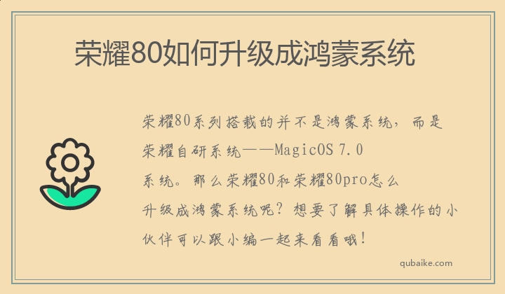荣耀80系列搭载的并不是鸿蒙系统,而是荣耀自研系统——MagicOS 7.0系统。那么荣耀80和荣耀80pro怎么升级成鸿蒙系统呢?想要了解具体操作的小伙伴可以跟小编一起来看看哦!