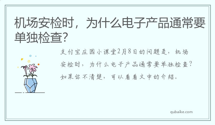 支付宝庄园小课堂2月8日的问题是,机场安检时,为什么电子产品通常要单独检查?如果你不清楚,可以看看文中的介绍。