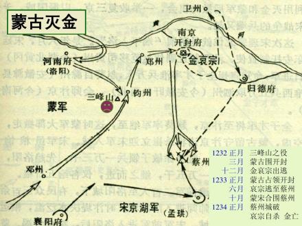 金朝第八位皇帝金宣宗完颜珣受蒙古帝国掠夺与威胁,于1214年宣布向南迁都开封府,称“南京”。1232年三峰山之战金军战败,蒙军围攻“南京”后,金哀宗先奔归德府(今河南商丘),最后逃到蔡州(今河南汝南)。