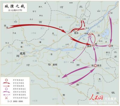 据《左传·僖公二十八年》记载,晋楚城濮之战,是我国古代战争史上著名的以少胜多的战例之一。双方兵力只能据参战兵车数来估计。一种计算是引《司马法》的说法,每车甲士3人步兵2人;另一说法据孙诒让《周礼正义》卷54认为《周礼》所说军队编制:五人为“伍”,五伍为“两”,“两”就是兵车一乘。具体地说就是每车甲士二伍十人,步三伍十五人,甲士中最勇者三人居车上,为甲首;余七人在车的左右,步卒跟在车后。这样每车甲士、徒兵共25人或30人。后一说法比较符合春秋时的实际情况。《诗经·鲁颂·閟宫》载“公车千乘……公徒三万”,也是这个比例。据此城濮之战晋国出动兵车七百乘,兵力估计为二万左右。楚国联合陈国蔡国,出动兵车一千四五百乘,兵力估计为四万左右。
