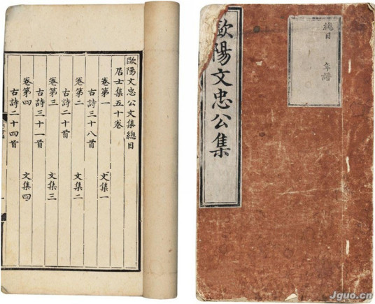 欧阳文忠公集,因欧阳修死后谥号为“文忠”,故名。共153卷,附录5卷。其中《居士集》、《易童子集》、《外制集》、《内制集》、《表奏书启四六集》、《奏议集》等一百十四卷,《归田录》、《诗话》、《长短句》等十九卷,《集中录跋尾》十卷,书简十卷。前附年谱,后附行状、墓志、传文等五卷。书中《居士集》为作者晚年自己编定,其余都是南宋周必大编定的。
