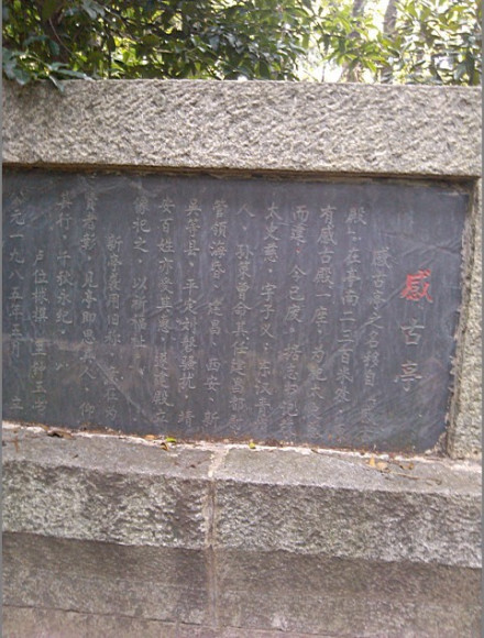 据史书记载,孙策曾命太史慈为建昌都尉,管辖着海昏、建昌、西安、新吴等县(今江西省西北部,含靖安、奉新、武宁、修水、永修、安义、和部分新建地区),平定刘磐骚扰,稳定社会治安,靖安百姓也得到了实惠。太史慈死后,靖安人民为了纪念这位平定匪乱的东吴大将,把他战亡的这座山取名为“感古山”,1985年在这山头上建的六角亭就依其地名,称为“感古亭”。亭为六角六柱葫芦顶,石台基,重檐式木亭,亭高4.5m,占地25m。亭柱上有两幅对联,一幅是“泽被乡人崇太史,亭名感古话东吴”,另一幅是“凤凰白露翔廊东,黄龙石马卧城南”。于是便建殿立像来纪念太史慈。亭旁碑柱上写着,因原来在此亭东南二三百米的地方有一“感古殿”, 后来“感古殿”毁,后人就在此最高处重建“感古亭”来纪念。碑上撰写到“新亭袭用旧称,意在为贤者彰,见亭即思其人,仰其行,千秋永记”。