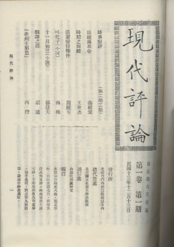 《现代评论》,是一本综合周刊,1924年12月13日在北京创刊,1928年12月29日出至第9卷209期停刊。 其间还出版3期增刊和一批“现代丛刊”。王世杰负责编辑,主要撰稿人有燕树棠、高一涵、周鲠生、陈西滢、陈翰笙、张奚若、李四光、胡适、唐有壬等,多为留学英、美的教授学者。徐志摩、丁西林、凌叔华、闻一多、沈从文、胡也频等亦有文学创作在该刊发表。内容涉及政治、经济、法律、文艺、哲学、教育、科学等各方面。
