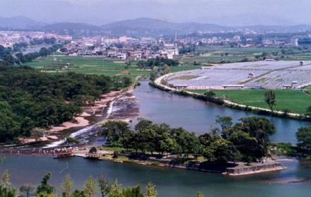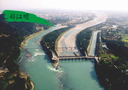 都江堰在四川成都西侧灌县境内。公元前316年秦国灭蜀,领有蜀地。秦昭王在位后期( 公元前276~前256年),蜀郡守李冰(公元前四世纪时人)在蜀人治水经验的基础上,于成都平原顶点,岷江刚出山口的江心中“造堋雍水”,叠砌分水鱼嘴,把岷江一分为二。“外江”为岷江正流(南江),泄洪排沙;“内江”为灌溉水渠(北江),导水灌田,使成都平原平畴万顷,沃野千里,成为我国著名的天府之地。内江乃傍玉垒山脚人工开凿之渠道,由凿开坚硬岩石所成“宝瓶口”引水,以供航运灌溉之用。宝瓶口上游内外江之间则有“飞沙堰”,可以将拦阻在宝瓶口外的过量洪水和沙石泄入外江。成都平原在四川盆地西部龙门山脉和龙泉山之间,乃由岷江、沱江及其它河流冲积而成。都江堰的建成,使外江成为洪水和沙石的排泄信道,使内江水系范围内的政经中心成都不仅解除了旱涝之害,同时又引进水源,满足了灌溉、通航和漂木的需求,是古代一个综合水资源开发最成功的典范。后魏郦道元《水经注》引南北朝《益州记》说:蜀郡“水旱从人,不知饥馑,沃野千里”,时人称为“天府”。如今我们仍称四川为天府之国,那么都江堰恰是天府中的一道“银河”。