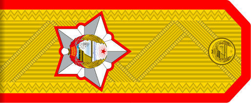 常服肩章,军官为棕绿色版面,肩章扣、星徽原是铜制的,51年改为校尉官为古铜色胶木扣、刺绣星徽。士兵肩章为半软体,版面无图案,有军兵种色边线,特务上士一纵一横红杠,上士一宽横条,中士三细横条,下士二细横条,上等兵一细横条,列兵无横条。平壤禁卫部队另有一种阅兵服士兵肩章,硬板,饰条为金色。