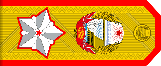 朝鲜人民军自1948年2月8日建军伊始由于军衔被认为是资产阶级的象征,因此未实行军衔制度,以军事职务代替军衔,直到1952年12月31日正式实行军衔制 。朝鲜人民军军衔主要用肩章表示,分军官礼服肩章和常服肩章,军官礼服肩章为金色铜丝编织版面,陆军红边、空军天蓝色、海军黑色、边防部队绿色、警察紫红色。缀银色铜星,大将3颗(三角形排列),大校、大尉4颗(纵向排列,53年后改为2纵2横),上校、上尉3颗(纵向),中将、中校、中尉2颗(纵向),少将、少校、少尉1颗,校官有两条军种色纵线、尉官一条,铜制金色肩章扣图案,元帅为国徽,将校尉官为军徽。版面图案将官为大斜纹花饰,校官为斜纹布图案、尉官为砌墙图案。
