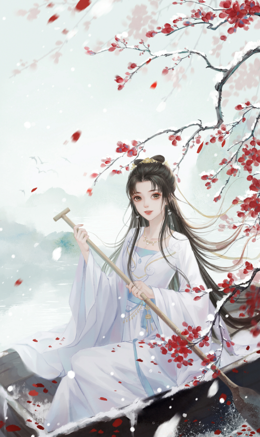 2.长发披肩,全身白衣,头发上束了条金带,白雪一映,更是灿然生光,全身装束犹如仙女一般。(第八回)