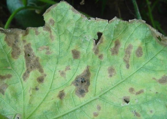 叶上病斑散生于叶脉间及叶缘,近圆形至多角形,直径2-6毫米,褐色,或中央暗灰色,边缘深褐色,病斑表面生淡黑色霉层,严重时病斑布满全叶,叶片早枯。