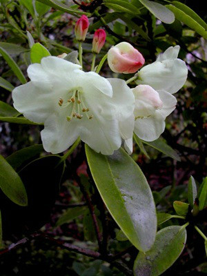 | 纯白杜鹃(变种): Rhododendron wardii W. W. Smith var.puralbum (Balf. f. et W. W. Smith) Chamb. ex Cullen et Chamb. 与黄杯杜鹃的主要区别:花冠纯白色,叶长卵形。花期5-6月。 产中国四川西南部、云南西北部。生于海拔3400-4600米的山坡草地及灌木丛中。模式标本采自云南中甸。 |