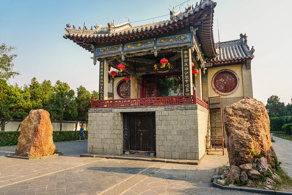 感德碑亭位于弥陀寺西北,原置于丹崖山腰,为木构八角凉亭,内立万民感德碑,为清康熙年间地方官为颂朝廷普免田赋之德而立;民国初皆毁,建国后修复碑亭并立碑。今存为八角十六柱拱顶飞檐式木石结构,亭内立感德碑。碑高约2.7米,宽约1.3米,南面镌“万寿无疆”四字,北面镌《重立感德碑记》。