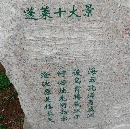 蓬莱十大景刻石嵌于蓬莱阁西耳房西壁,共10方,均为墨石阴刻,内容分别为“日出扶桑”“晚潮新月”“千斛碎玉”“万里澄波”“仙阁凌空”“神山现市”“狮洞烟云”“渔梁歌钓”“铜井金波”“漏天滴润”,作者不详,刻画线条流畅写意,每方景刻配有清人徐人凤诗一首,图文并茂,相得益彰。