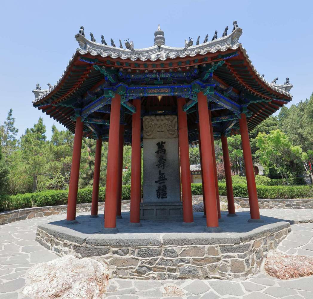 吕祖“寿”字碑在吕祖殿前,明廊西侧,面东而立。“寿”字草体,笔力雄健,盘郁苍劲,碑下款署“光绪甲申仲冬勒于蓬莱丹崖之吕祖阁;志斋郑锡鸿谨摹。江西九江烟水亭纯阳殿“寿“字碑之“寿”字,与此一般无二,当即为摹者所据,九江碑上尚有篆书“九转丹成“四字,意草书“寿”字系草书“九转丹成”四字拼合而成。