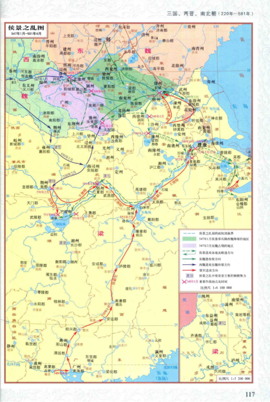 南北朝时期进入到公元6世纪,逐渐由南北对峙转入三足鼎立的格局。523年以后,北魏陷入六镇起义的混乱局势中,528年发生河阴之变,契胡尔朱氏集团控制北魏政权。532年,高欢消灭尔朱氏。534年,宇文泰割据关陇,孝武帝元修西奔,后被宇文泰所害。随即高欢和宇文泰相继拥立元善见和元宝炬为傀儡皇帝,北魏遂分裂为高欢控制的东魏和宇文泰控制的西魏,两个政权间战争不断。加上南方一直渴望收复中原的梁朝,形成了中国历史上的后三国时代,这就是侯景之乱的时代大背景。