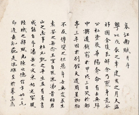 孙策开创基业统一江南三分天下,创业之始他的军队不过五百人;项籍率领江东子弟起兵,人员只有八千。这样就剖分山河,割据天下。哪里有号称百万的义师,竟一朝卷甲溃败,让作乱者肆意戮杀,如割草摧木一般?长江淮河失去了水岸的阻挡,军营壁垒缺少了藩篱的坚固,使得那些得逞一时的作乱者得以暗中勾结,那些持锄耰和棘矜的人得到乘虚而入的机会。莫不是江南一带的帝王之气,已经在三百年间终止了吗!于此可知并吞天下,最终不免于秦王子婴在轵道旁投降的灾难;统一车轨和文字,最终也救不了晋怀、愍二帝被害于平阳的祸患。呜呼!山岳崩塌,既已经历国家危亡的厄运;春秋更替,必然会有背井离乡的悲哀。天意人事,真可以令人凄怆伤心的啊!何况又舟船无路,银河不是乘筏驾船所能上达;风狂道阻,海中的蓬莱仙山也无可以到达的希望。因踬者欲表达自己的肺腑之言,操劳者须歌咏自己所经历的事。我写此赋,纵然陆机听了拍掌而已,也心甘情愿;张衡见了将轻视它,本是理所当然的。