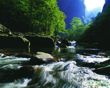金鞭溪是天然形成的一条美丽的溪流,因金鞭岩而得名。溪水弯曲自西向东流去,即使久旱,也不会断流。