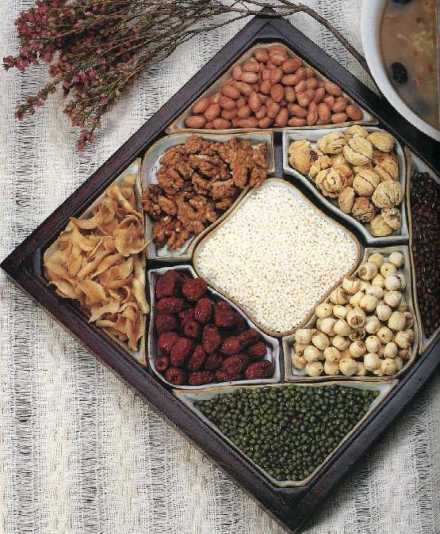不可小看“腊八粥”中果仁的食疗作用,花生和核桃是不可缺少的原料。花生有“长生果”的美称,具有润肺、和胃、止咳、利尿、下乳等多种功能。核桃仁具有补肾纳气、益智健脑、强筋壮骨的作用,还能够增进食欲、乌须生发,核桃仁中所含的维生素E更是医药学界公认的抗衰老药物。