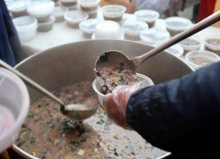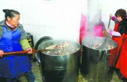 在山东“孔府食制”中,规定“腊八粥”分两种,一种是用薏仁米、桂圆、莲子、百合、栗子、红枣、粳米等熬成的,盛入碗里还要加些“粥果”,主要是雕刻成各种形状的水果,是为点缀。这种粥专供孔府主人及十二府主人食用。另一种是用大米、肉片、白菜、豆腐等煮成的,是给孔府里当差们喝的。