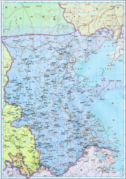 北齐继承了东魏所控制的地盘,占有今黄河下游流域的河北、河南、山东、山西以及苏北、皖北的广阔地区。同时与其并存的王朝有西魏、北周(取代西魏)、梁、陈(取代梁,但只占有前者部分领土)等。北齐天保三年(552年)以后,北击库莫奚、东北逐契丹、西北破柔然,西平山胡,南取淮南,势力一直延伸到长江边,这时北齐的国力达到鼎盛。武成帝昏庸好色,北齐国力大衰,不久去世,由后主高纬继立。高纬也是昏庸好色,国政混乱,还诛杀名将斛律光。之后北齐被南陈攻下淮南,并在577年亡于北周。