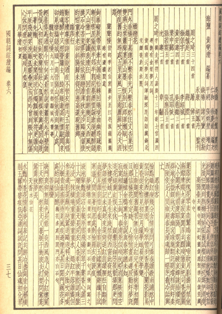 全书分二十四卷,无总目录。166页,每页分上下两部分。每卷首编辑所收录《词》作者的名单,及每位作者《词》的篇数。并略微简述该作者的生平事迹。