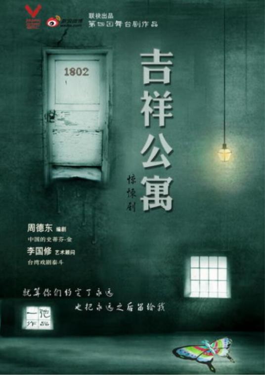 《吉祥公寓1802》是由至乐汇舞台剧、新浪微博出品,周德东编剧,一池、董天翼执导,任素汐、郑磊、査可欣主演的爱情悬疑舞台剧,于2011年11月2日在麻雀瓦舍首演。