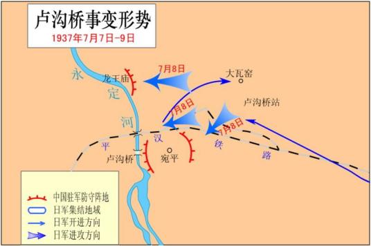 1936年,日本华北驻屯军以卑鄙的手段占领丰台,将下一个目标定在了卢沟桥。七七事变爆发前夕,北平的北、东、南三面已经被日军控制:北面,是部署于热河和察东的关东军一部;西北面,有关东军控制的伪蒙军8个师约4万人;东面,是伪“冀东防共自治政府”及其所统辖的约17000人的伪保安队;南面,日军已强占丰台,逼迫中国军队撤走。