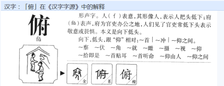 俯:fǔ ㄈㄨˇ。从人、府声。文书所藏、财物所聚之处是府之范式。人、府两范式叠加,人巡察而低首是俯之范式。