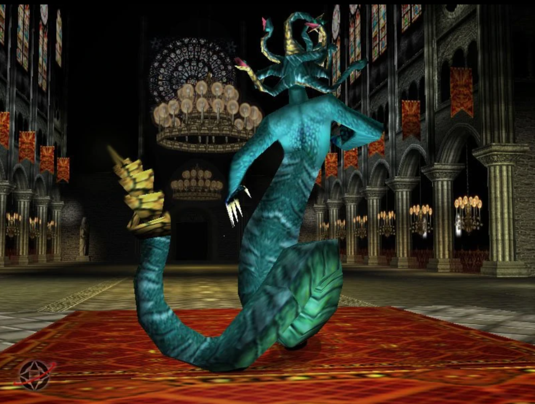 最终 BOSS 德古拉的造型,和我们印象中没多大区别。当时的 3D 技术能做得这样已经很不错了。