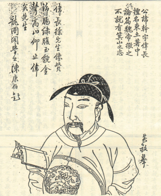 徐干(170年-217年),字伟长,北海剧(今山东潍坊市)人。清元道体,六行修备,聪识洽闻,草翰成章,轻官忽禄,不耽世荣,游居邺下。魏文尝与吴质书曰:“伟长怀才抱质,恬淡寡欲,有箕山之节,可谓彬彬君子矣。”