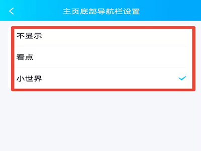 4、勾选“不显示”、“看点”或“小世界”,即可局部更换导航栏图标的位置。