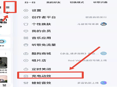 1、打开酷狗音乐,点击右上角的三横图标,打开“充电动效”。