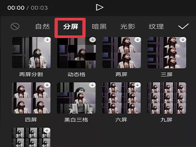 4、向左滑动特效栏,选中“分屏”特效。