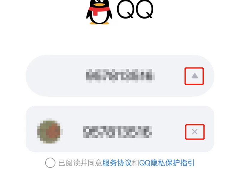 1、打开手机qq,在登陆页面中点击账号栏右边的下滑箭头,选择删除。